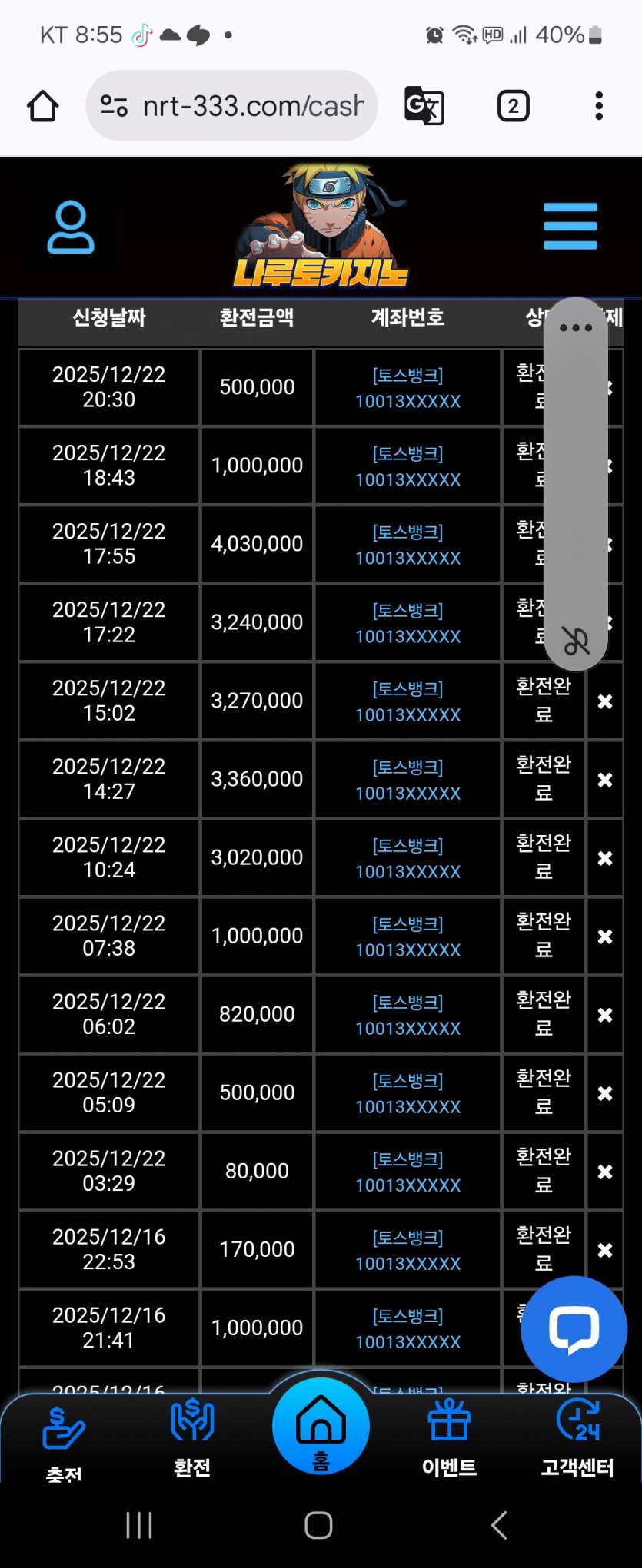 27년을 살면서 12년을 도박했는데 나루토 만큼 충환전이리 빠