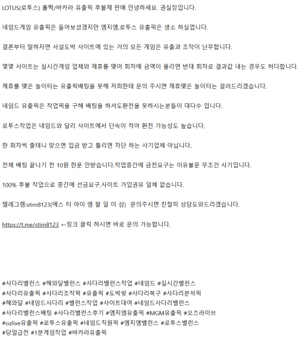 LOTUS유출픽 (홀짝/바카라) 100% 후불제 판.매 작업 텔레그램:stim8123